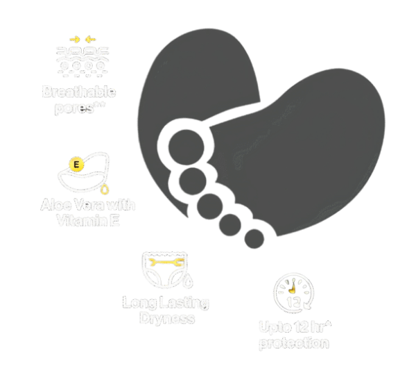 Our Diapers Keep Your Baby’s Skin Fresh with Breathable Pores and Gentle Care From Aloe Vera with Vitamin E. They Provide Long-Lasting Dryness and Up to 12 Hours of Reliable Protection, Keeping Your Little one Happy and Comfortable Day and Night.